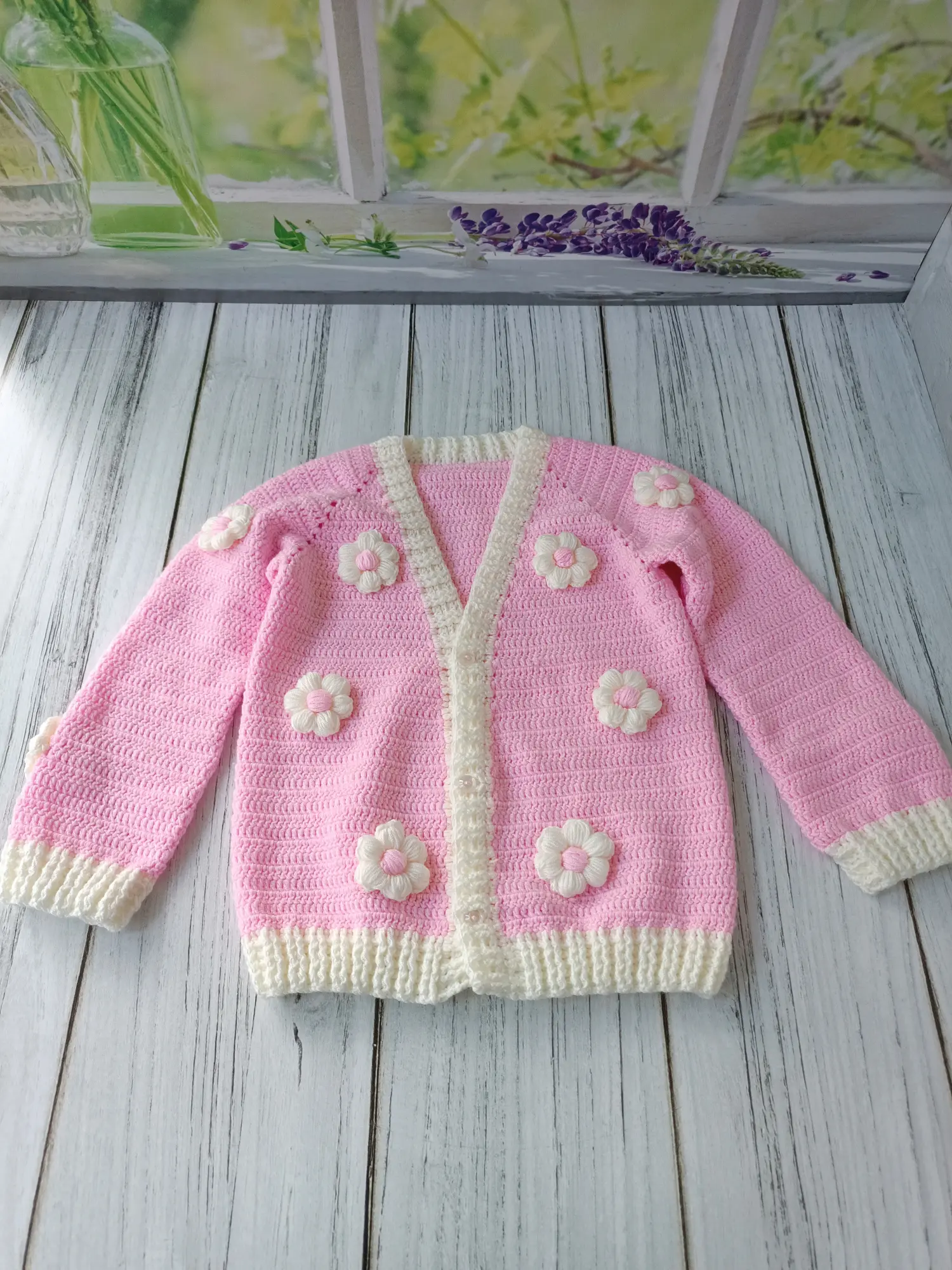 Designed with a soft texture and elegant floral details, this hand-knitted baby cardigan is carefully crafted to ensure your little one is both stylish and comfortable. Its powder pink color and cream trim offer a simple yet eye-catching look. The three-dimensional floral appliqués add a cute and special touch.